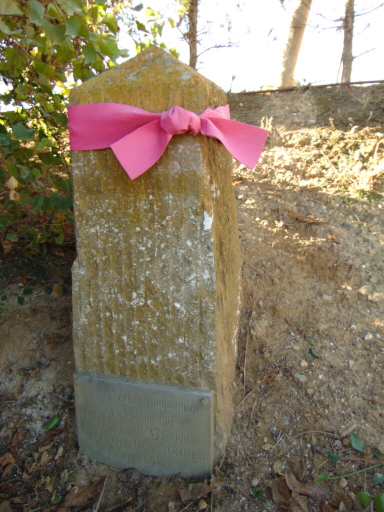 Actualment, se creu que la fosa on estan els cossos dels onze republicans d’Alcampell afusellats a Binèfar (a més d’una vintena d’Almacelles, Alfarràs i Gimenells) es troba al davall d’un almacen, per la qual cosa no han pogut ser recuperats i dignificats. A la vora del lloc on suposadament van morir, l’Ajuntament d’Alcampell hi va instal·lar un petit monòlit de record 48 anys després del seu assassinat, en el qual es pot llegir: “Imperecedero recuerdo a un sacrificio de las víctimas de Alcampel por la paz. 10 de abril de 1938-1986”.